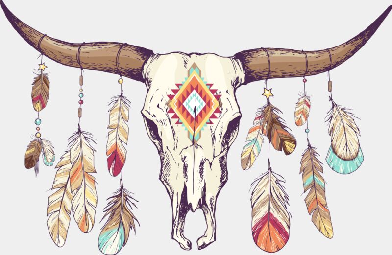 Watercolor Tribal Cow Skull Feather 1